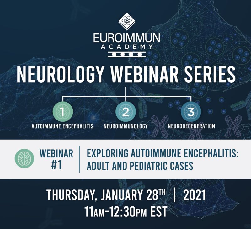 The Euroimmun Academy is proud to present the upcoming “Neurology Webinar Series”. Join us on January 28th from 11-12:30pm EST for our first webinar exploring Autoimmune Encephalitis. For more information or to Register for this free virtual event please click here. This webinar is open to patients, families, and physicians. Speakers include Dr. Amanda Piquet and Dr. Stanley Naides.